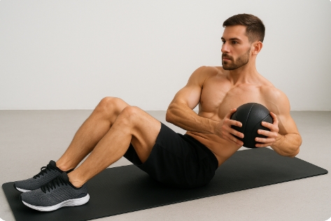 옆구리와 측면 복근까지 자극할 수 있는 운동입니다.바닥에 앉아 무릎을 세우고 발을 살짝 들어 균형을 잡은 상태에서 양손을 모아 좌우로 트위스트 합니다. 덤벨이나생수병을 들고 하면 더 효과적입니다.