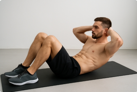 복근운동의 기본이 되는 크런치는 복직근을 자극하는 가장 대표적인 운동입니다. 등을대고 누운상태에서 무릎을 세우고 손은 머리 뒤에 가볍게 위치시킵니다.상체를 들어올릴때 복근에 집중하며 천천히 올라갔다 내려옵니다.